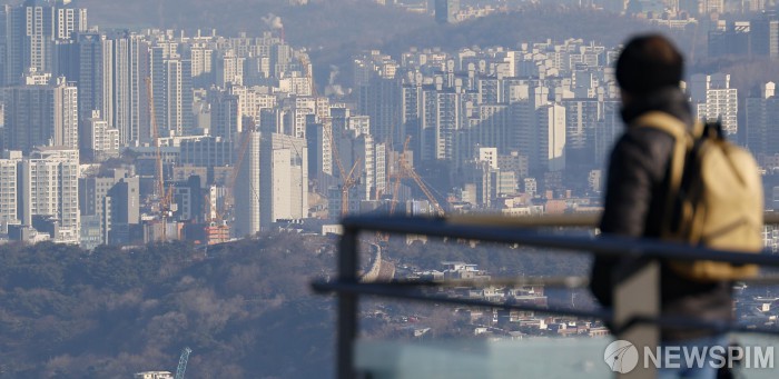 [서울=뉴스핌] 류기찬 기자 = 39세 이하 가구주 무주택 가구가 역대 최대 수준으로 늘었다. 지난 8일 국가통계포털(KOSIS)에 따르면 2024년 기준 전국 무주택 가구는 361만2321가구이며, 이 가운데 서울은 99만2856가구로 역시 최대치를 기록했다. 수도권 집중과 높은 집값, 제한적인 공급이 겹치며 청년층의 주택 진입 장벽이 높아지고 있다는 분석이다. 사진은 9일 오전 서울 남산에서 바라본 서울 시내 아파트 단지. 2026.02.09 ryuchan0925@newspim.com