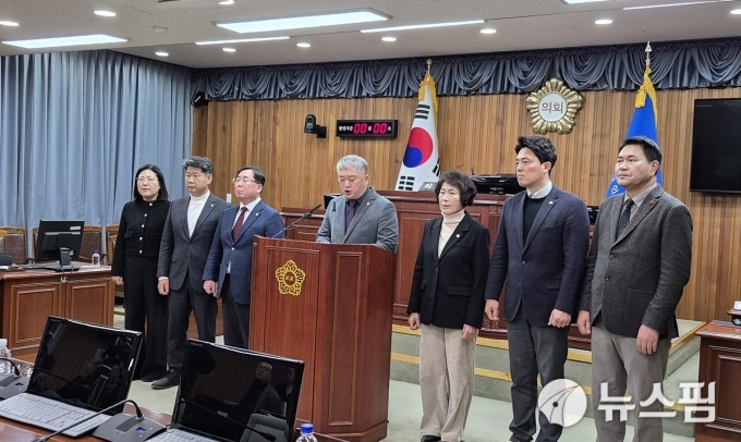 [울진=뉴스핌] 남효선 기자 = 경북 울진군의회가 9일 본회의장에서 의원 8명 전원 명의로 '대구경북행정통합 졸속 추진 반대'를 담은 성명을 내고 "TK행정통합 추진 중단"을 촉구하고 있다. 2026.02.09 nulcheon@newspim.com