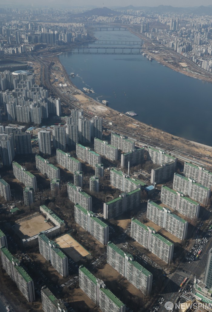 [서울=뉴스핌] 정일구 기자 = 이재명 대통령이 다주택자 양도소득세 중과 유예 연장이 없음을 거듭 확인하며 다주택자들의 매도를 유도하자 세금 부담을 고려한 강남권 다주택자 중심으로 매물이 늘고 있다. 한국부동산원에 따르면 2월 첫째 주(2일 기준) 서울 동남권(강남·서초·송파·강동구) 아파트 매매수급지수는 101.9로 최근 2주 연속 하락해 지난해 9월 첫째 주(101.9) 이후 21주 만에 최저치를 기록했다. 사진은 9일 서울 송파구 롯데월드타워 전망대 서울스카이에서 바라본 아파트 단지 모습. 2026.02.09 mironj19@newspim.com