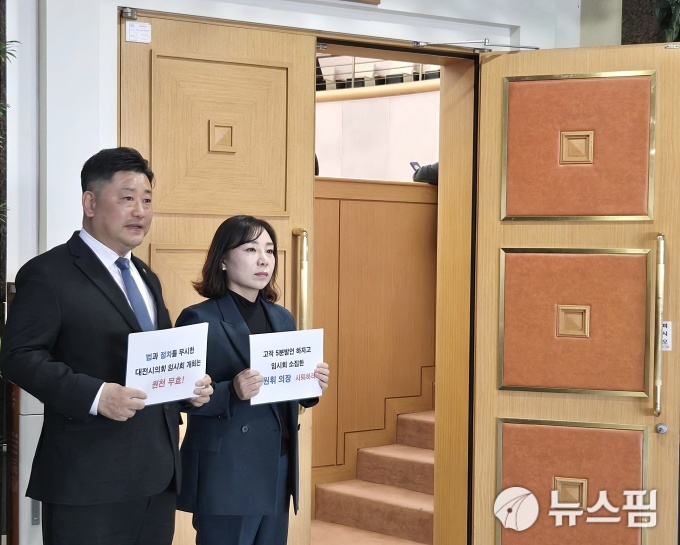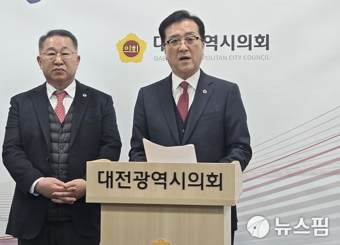 9일 대전시의회에 따르면 조원휘 대전시의장과 이한영 운영위원장은 시의회 기자실에서 기자회견을 열고 민주당 시의원들이 제기한 '졸속 임시회' 주장에 대해 정면 반박했다. 앞서 민주당 소속 김민숙·방진영 의원은 이날 시의회 기자실에서 "대전충남 행정통합 관련 주민투표를 위한 이번 임시회는 '긴급한 사안'에 해당하지 않는다"며 "의장의 독단적 판단에 따른 지방자치법 위반"이라고 주장한 바 있다.