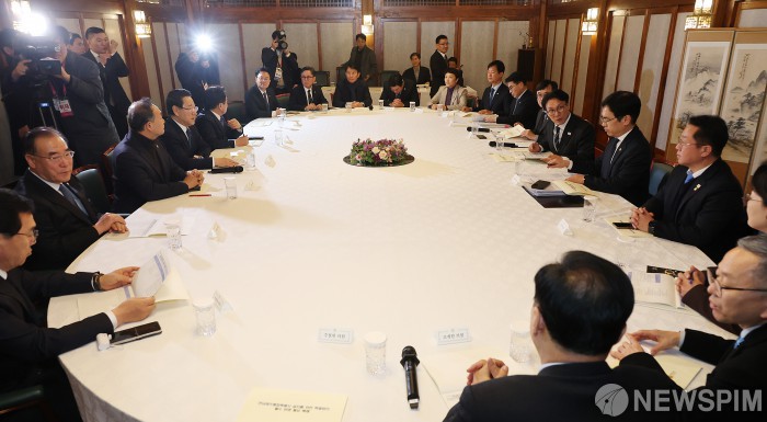 [서울=뉴스핌] 이형석 기자 = 김민석 국무총리가 김영록 전남도지사, 강기정 광주시장과 함께 9일 오후 서울 종로구 총리공관에서 전남광주행정통합 관련 면담을 하고 있다. 2026.02.09 leehs@newspim.com