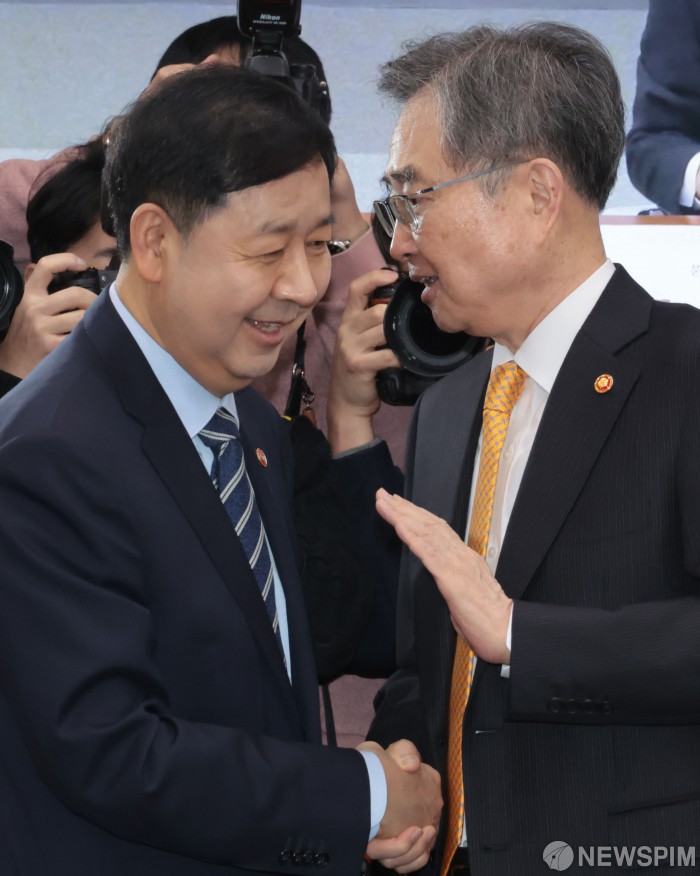[서울=뉴스핌] 이길동 기자 = 구윤철 부총리 겸 재정경제부 장관와 조현 외교부 장관이 10일 서울 종로구 정부서울청사에서 열린 대외경제관계장관회의에서 인사하며 대화를 하고 있다.2026.02.10 gdlee@newspim.com