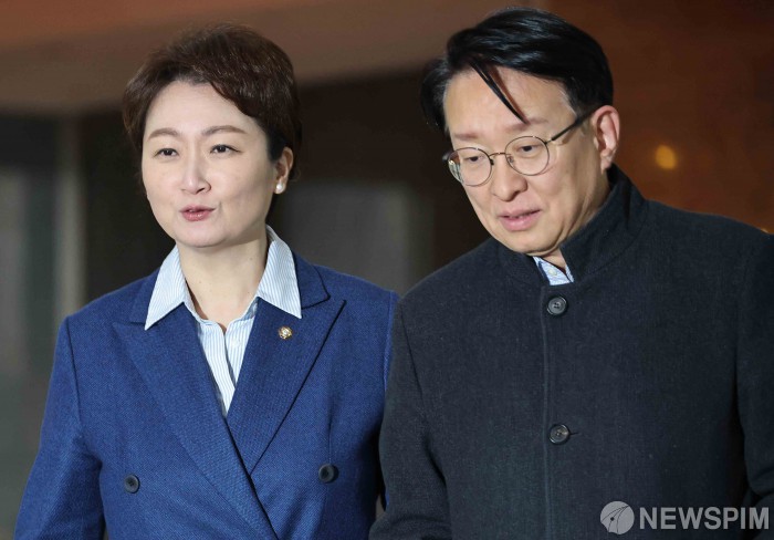 [서울=뉴스핌] 윤창빈 기자 = 이언주-권칠승 더불어민주당 의원이 10일 오전 서울 여의도 국회에서 열린 조국혁신당 합당과 관련한 비공개 의원총회에 참석하고 있다. 2026.02.10 pangbin@newspim.com