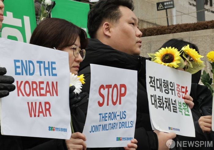 [서울=뉴스핌] 양윤모 기자 = 한반도 평화행동 회원들이 10일 오전 서울 종로구 세종문화회관 계단에서 '2026년, 적대를 끝내고 한반도 평화 공존의 길을 열자' 행사를 개최 했다. 행사 참석자들은 한반도 평화 공존의 출발점은 적대와 한국전쟁 종식이며,상호 군사위협 중단,상대체제 존중에 기초한 관계개선의 필요성을 강조했다. 2026.02.10 yym58@newspim.com