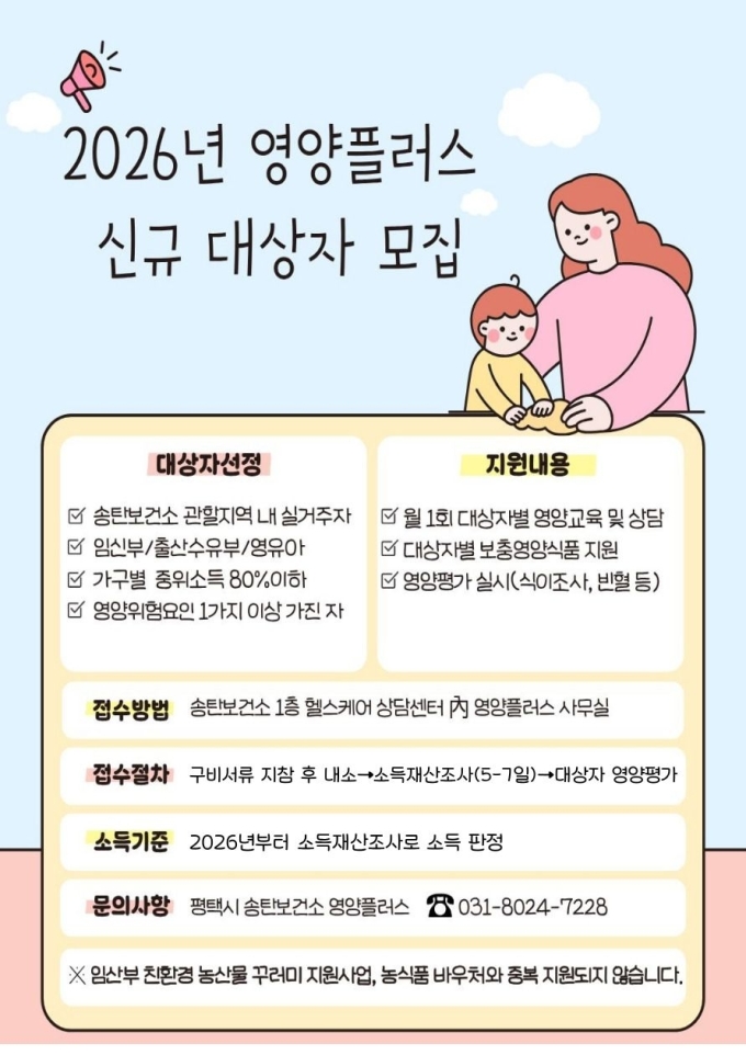 송탄보건소 관계자는 "임산부와 영유아는 성장과 건강에 영양 관리가 매우 중요한 시기"라며 "영양플러스 사업으로 생애주기별 맞춤 지원을 아끼지 않겠다"고 전했다.