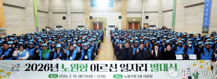 [서울=뉴스핌] 오승록 노원구청장이 10일 오전 서울 노원구 노원구청 2층 대강당에서 열린 ‘노원형 어르신일자리’ 발대식에 참석해 기념촬영을 하고 있다. ‘노원형 어르신일자리’는 60세 이상 노원구 거주 어르신들에게 소득 조건 없이 적합한 일자리를 제공하는 동시에 지역 환경 개선에 기여할 수 있도록 마련된 구 자체 사업이다. 올해 사업은 2월부터 11월까지 진행되며, 총 450명의 어르신이 ‘클린지킴이단’으로 활동할 예정이다. [사진=노원구청] 2026.02.10 photo@newspim.com
