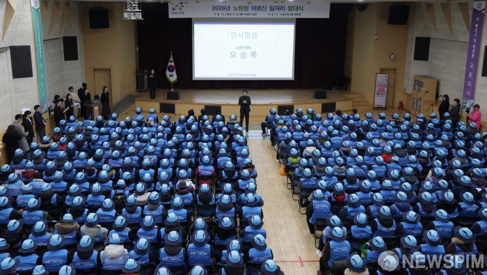 [서울=뉴스핌] 오승록 노원구청장이 10일 오전 서울 노원구 노원구청 2층 대강당에서 열린 ‘노원형 어르신일자리’ 발대식에 참석해 인사말을 하고 있다. ‘노원형 어르신일자리’는 60세 이상 노원구 거주 어르신들에게 소득 조건 없이 적합한 일자리를 제공하는 동시에 지역 환경 개선에 기여할 수 있도록 마련된 구 자체 사업이다. 올해 사업은 2월부터 11월까지 진행되며, 총 450명의 어르신이 ‘클린지킴이단’으로 활동할 예정이다. [사진=노원구청] 2026.02.10 photo@newspim.com