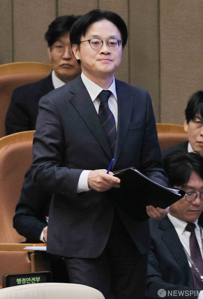 [서울=뉴스핌] 윤창빈 기자 = 김정관 산업통상부 장관이 10일 오후 서울 여의도 국회에서 열린 경제에 관한 대정부질문에서 답변을 위해 단상으로 향하고 있다. 2026.02.10 pangbin@newspim.com