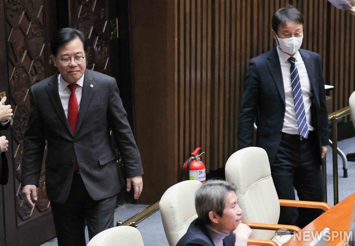 [서울=뉴스핌] 윤창빈 기자 = 한병도 더불어민주당 원내대표, 송언석 국민의힘 원내대표가 10일 오후 서울 여의도 국회에서 열린 본회의에서 대화를 나누고 각자의 자리로 향하고 있다. 2026.02.10 pangbin@newspim.com