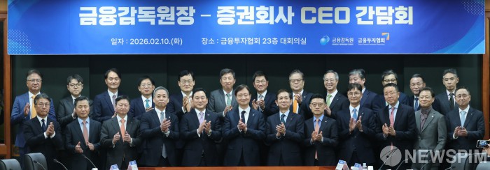 [서울=뉴스핌] 이형석 기자 = 이찬진 금융감독원장이 10일 오후 서울 여의도 금융투자협회에서 열린 증권회사 CEO 간담회에서 참석자들과 기념촬영을 하고 있다. 2026.02.10 leehs@newspim.com
