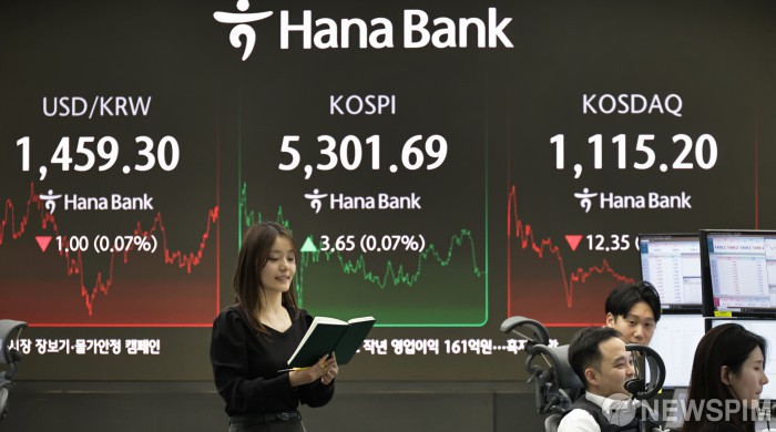 [서울=뉴스핌] 양윤모 기자= 10일 오후 코스피가 전장 종가보다 3.65 포인트(0.07%) 상승하며 5301.69 로, 코스닥은 12.35 포인트(1.10%) 하락한 1115.20 으로 거래를 마감한 가운데, 서울 중구 하나은행본점 딜링룸에서 직원들이 업무를 보고 있다. 서울외환시장에서 달러/원 환율은 전장 대비 1.00원 하락한 1459.30원에 주간거래를 마감했다. 2026.02.10 yym58@newspim.com