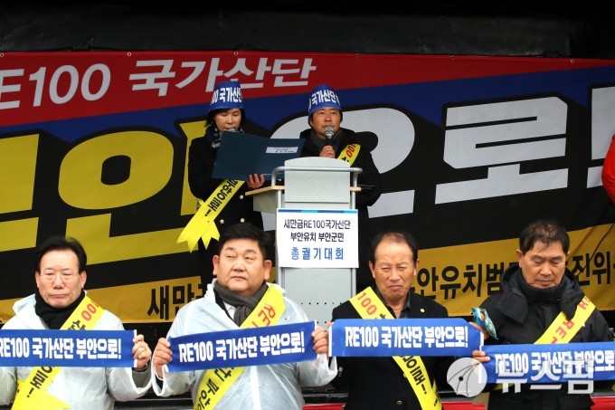 이어 소상공인, 청년, 농민, 어민, 학생 대표들이 차례로 발언에 나서 일자리 창출과 지역경제 회복, 지속가능한 발전을 위해 RE100 국가산단이 반드시 부안에 들어서야 한다고 호소했다.