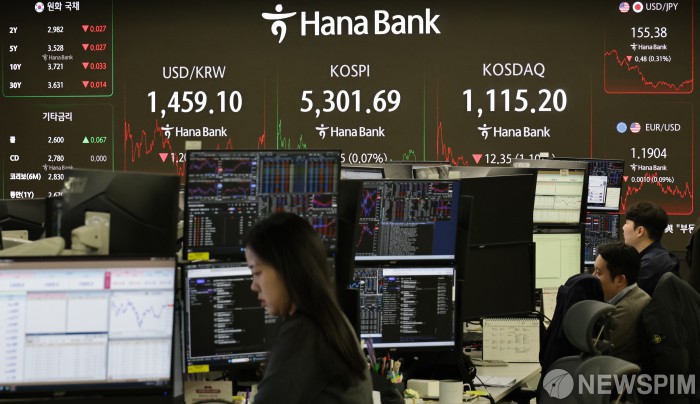 [서울=뉴스핌] 양윤모 기자= 10일 오후 코스피가 전장 종가보다 3.65 포인트(0.07%) 상승하며 5301.69 로, 코스닥은 12.35 포인트(1.10%) 하락한 1115.20 으로 거래를 마감한 가운데, 서울 중구 하나은행본점 딜링룸에서 직원들이 업무를 보고 있다. 서울외환시장에서 달러/원 환율은 전장 대비 1.20원 하락한 1459.10원에 주간거래를 마감했다. 2026.02.10 yym58@newspim.com