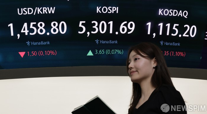 [서울=뉴스핌] 양윤모 기자= 10일 오후 코스피가 전장 종가보다 3.65 포인트(0.07%) 상승하며 5301.69 로, 코스닥은 12.35 포인트(1.10%) 하락한 1115.20 으로 거래를 마감한 가운데, 서울 중구 하나은행본점 딜링룸에서 직원들이 업무를 보고 있다. 서울외환시장에서 달러/원 환율은 전장 대비 1.50원 하락한 1458.80원에 주간거래를 마감했다. 2026.02.10 yym58@newspim.com