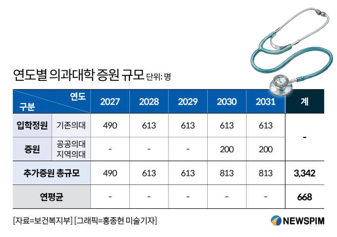 [서울=뉴스핌] 황혜영 기자 = 정부가 2027학년도부터 5년간 의과대학 입학정원을 연평균 668명 늘려 총 3342명을 추가로 양성하기로 했다. 모든 증원 인력은 지역의사제로 선발해 지역·필수·공공의료 인력 확충에 집중하겠다는 계획이다.
