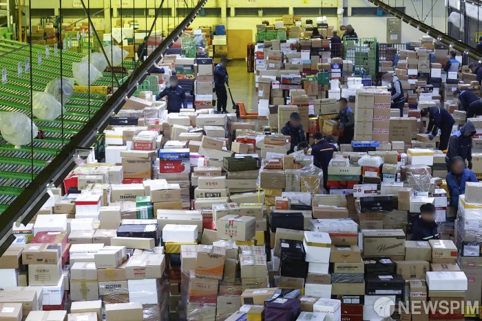 [서울=뉴스핌] 류기찬 기자 = 설 명절을 앞둔 11일 오전 서울 광진구 동서울우편물류센터에서 작업자들이 택배 상자 분류작업을 하고 있다. 2026.02.11 ryuchan0925@newspim.com