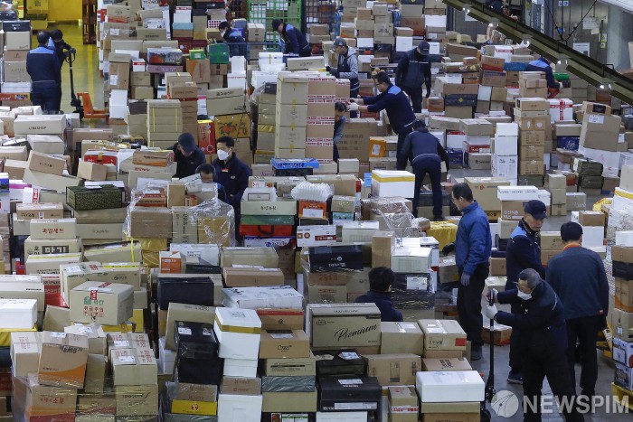 [서울=뉴스핌] 류기찬 기자 = 설 명절을 앞둔 11일 오전 서울 광진구 동서울우편물류센터에서 작업자들이 택배 상자 분류작업을 하고 있다. 2026.02.11 ryuchan0925@newspim.com