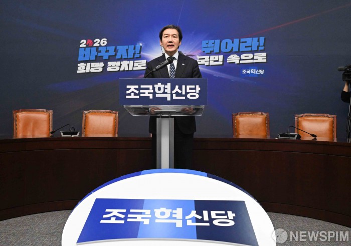 [서울=뉴스핌] 윤창빈 기자 = 조국 조국혁신당 대표가 11일 오전 서울 여의도 국회에서 열린 긴급 최고위원회의에서 모두발언을 하고 있다. 2026.02.11 pangbin@newspim.com
