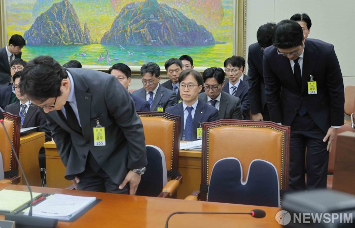 [서울=뉴스핌] 윤창빈 기자 = 이재원 빗썸 대표를 비롯한 임원진들이 11일 오전 서울 여의도 국회 정무위원회에서 열린 빗썸 비트코인 오지급 사고와 관련한 긴급 현안질의에서 고개숙여 사과하고 있다. 2026.02.11 pangbin@newspim.com