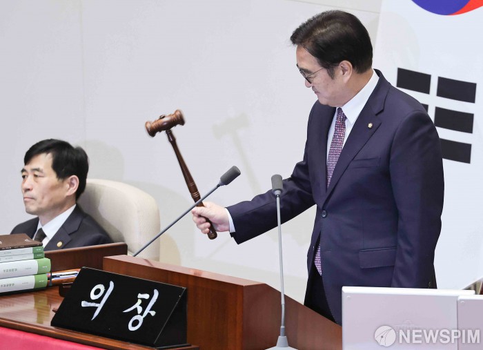 [서울=뉴스핌] 윤창빈 기자 = 우원식 국회의장이 11일 서울 여의도 국회에서 열린 본회의에서 의사봉을 두드리고 있다. 2026.02.11 pangbin@newspim.com