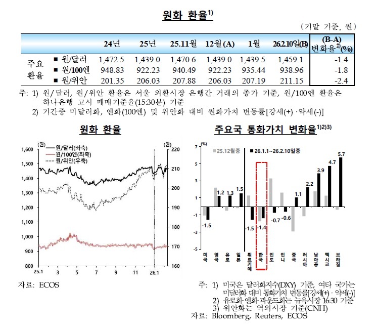 달러/원 환율은 10일 기준 1459.1원으로 지난해 12월 말(1439.0원) 대비 1.4% 상승(원화 약세)했다. 엔/원 환율은 938.96원으로 1.8% 상승했고, 위안/원 환율은 211.15원으로 2.4% 올랐다.