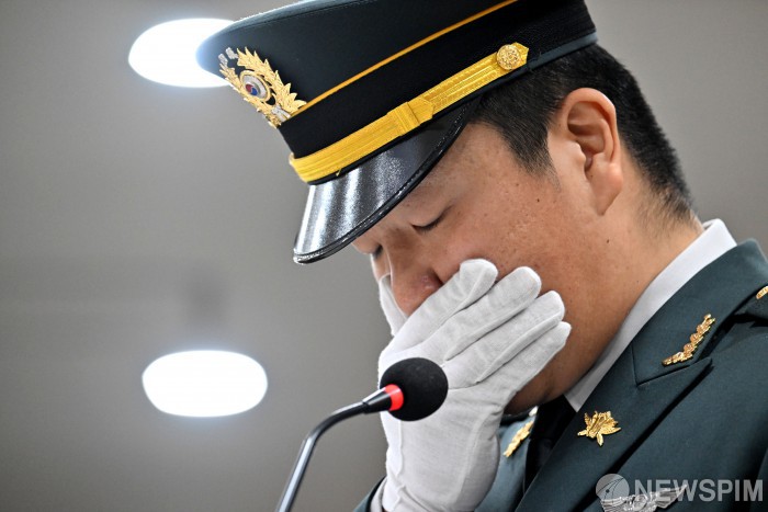 [성남=뉴스핌] 사진공동취재단 = 12일 오전 경기도 성남시 국군수도병원 영결식장에서 열린 육군 항공기 사고 순직자에 대한 영결식에서 희생자들의 부대 동료가 추모사 도중 눈물을 흘리고 있다. 2026.02.12 photo@newspim.com