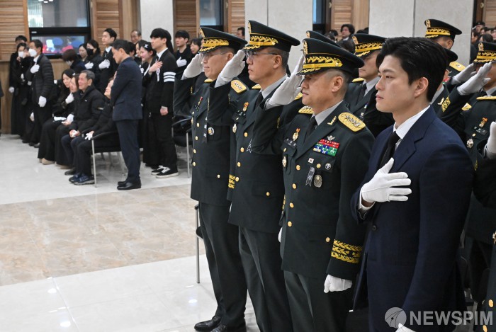 [성남=뉴스핌] 사진공동취재단 = 12일 오전 경기 성남시 국군수도병원 영결식장에서 열린 육군 항공기 사고 순직자에 대한 영결식에서 참석자들이 희생자들을 추모하고 있다. 2026.02.12 photo@newspim.com