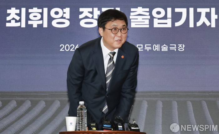 [서울=뉴스핌] 양윤모 기자 = 최휘영 문체부 장관이 12일 오전 서울 서대문구 충정로 모두예술극장에서 개최된 '2026 출입기자 간담회'에 참석해 취재진들에게 인사를 하고 있다. 2026.02.12 yym58@newspim.com