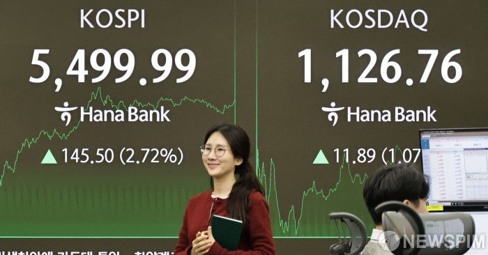 코스피 2.72% 상승 5499...코스닥 1.07% 상승 1126 거래중