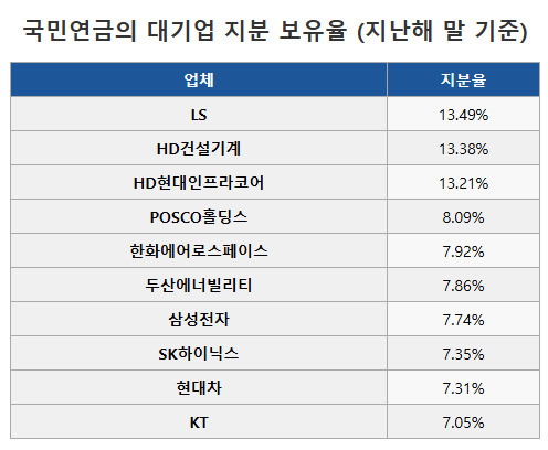 금융정보업체 에프앤가이드 등에 따르면 지난해 말 기준 국민연금이 지분 5% 이상을 보유한 상장사는 총 269개로, 이 가운데 국민연금은 LS(13.49%)을 비롯 HD건설기계(13.38%), HD현대인프라코어(13.21%)에 대해 10% 이상의 지분을 보유하고 있다. 또한 POSCO홀딩스(8.09%), 삼성전자(7.74%)와 SK하이닉스(7.35%), 현대차(7.31%), 한화에어로스페이스(7.92%), 두산에너빌리티(7.86%), KT(7.05%), 삼성바이오로직스(6.68%), 삼성에피스홀딩스(6.70%) 등 주요 대기업의 지분 역시 5% 이상 보유한 것으로 파악된다.
