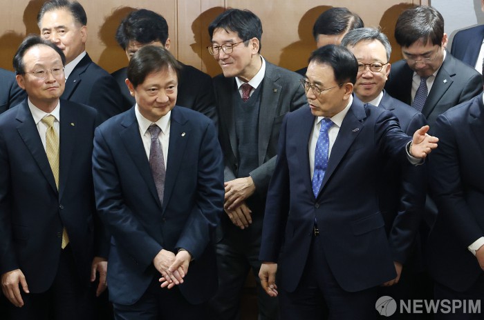 [서울=뉴스핌] 정일구 기자 = 이찬진 금융감독원장이 12일 오후 서울 중구 은행회관에서 열린 금융감독원장-은행장 간담회에서 조용병 은행연합회 회장을 비롯한 국내은행 은행장들과 기념촬영을 마친 뒤 자리로 이동하고 있다. 2026.02.12 mironj19@newspim.com