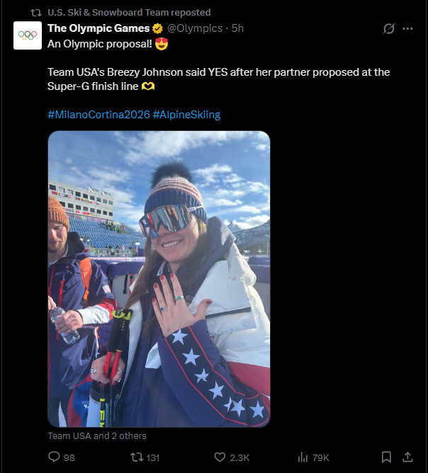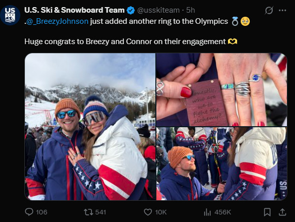 미국 스키 대표팀은 12일(한국시간) 공식 소셜미디어 계정에 "존슨이 올림픽에서 또 하나의 링을 추가했다! 브리지와 코너의 약혼을 축하한다"고 전했다.