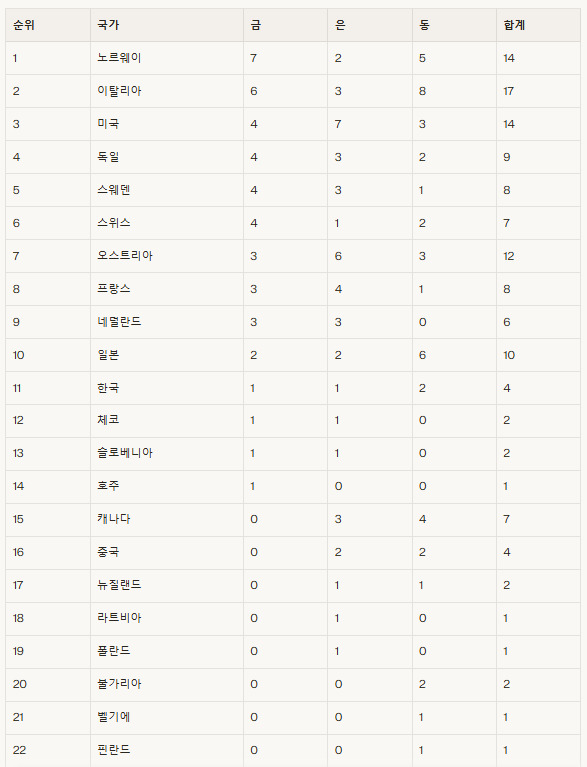 2008년 11월 3일생 최가온(세화여고)과 2007년 10월 30일생 임종언(고양시청)이 설원과 빙판에서 나란히 대역전 드라마를 쓰고 한국 선수단에 금메달과 동메달을 안겼다. 한국은 금메달 1개, 은메달 1개, 동메달 2개를 획득하며 메달 종합 순위 공동 15위에서 11위로 뛰어올랐다. 1위는 노르웨이(금 7개, 은 2개, 동 5개), 2위는 이탈리아(금 6개, 은 3개, 동 8개)다.