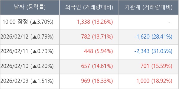 [서울=뉴스핌] 로보뉴스 = 13일 10시 15분 현재 KPX케미칼(025000)은 전일 대비 3.70% (현재가 53,200원) 상승했고, 외국인이 최근 5일 연속 순매수(누적 4,194주, 잠정) 행진을 하고 있다.