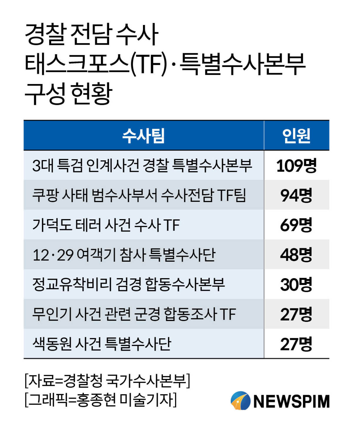 18일 경찰청 국가수사본부에 따르면 경찰 내 7개 전담 수사 TF와 특별수사본부는 총 404명 규모로 각 수사팀은 쿠팡, 12·29 여객기 참사, 통일교 등 정교유착비리, 북한 무인기 사건, 색동원 사건 등을 수사 중이다.