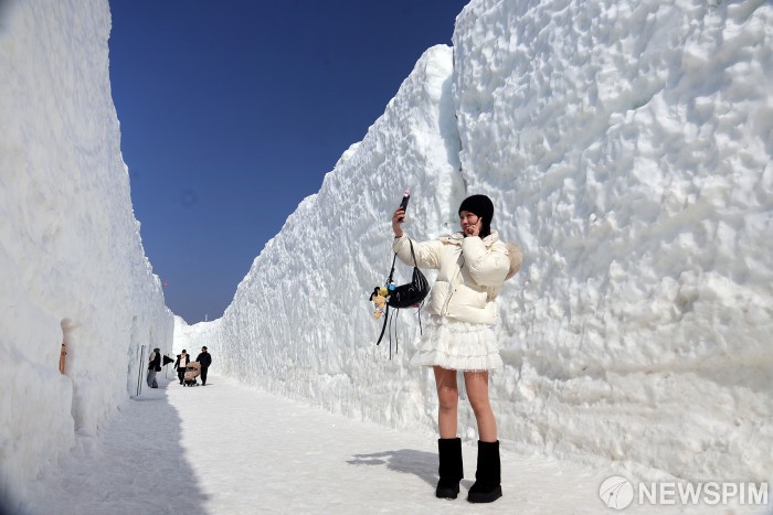 [서울=뉴스핌] 13일 평창군 대관령면 횡계리 송천 일대 축제장에서 개막한 전국 최고의 눈과 얼음축제인 '제34회 평창 대관령눈꽃축제'를 찾은 방문객들이 눈 빙벽을 배경으로 기념사진을 촬영하고 있다. 밀라노-코르티나 동계올림픽 개최 시기에 맞춰 ‘동계 꿈나무 눈동이의 국가대표 성장기’를 주제로 열리는 올해 축제는 방문객들에게 다양한 눈과 얼음조각, 겨울 체험거리를 제공한다. 축제장 곳곳에는 대형 눈썰매장과 눈·얼음조각, 아이스카페 등이 조성돼 멋진 눈과 얼음조각 감상과 휴식을 취할 수 있고 크로스컨트리스키, 컬링, 바이애슬론 등 동계종목 체험 프로그램도 운영된다. [사진=평창관광문화재단] 2026.02.13 photo@newspim.com