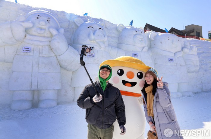 [서울=뉴스핌] 13일 평창군 대관령면 횡계리 송천 일대 축제장에서 개막한 전국 최고의 눈과 얼음축제인 '제34회 평창 대관령눈꽃축제'를 찾은 방문객들이 눈동이 마스코트와 대형 눈조각을 배경으로 기념사진을 촬영하고 있다. 밀라노-코르티나 동계올림픽 개최 시기에 맞춰 ‘동계 꿈나무 눈동이의 국가대표 성장기’를 주제로 열리는 올해 축제는 방문객들에게 다양한 눈과 얼음조각, 겨울 체험거리를 제공한다. 축제장 곳곳에는 대형 눈썰매장과 눈·얼음조각, 아이스카페 등이 조성돼 멋진 눈과 얼음조각 감상과 휴식을 취할 수 있고 크로스컨트리스키, 컬링, 바이애슬론 등 동계종목 체험 프로그램도 운영된다. [사진=평창관광문화재단] 2026.02.13 photo@newspim.com