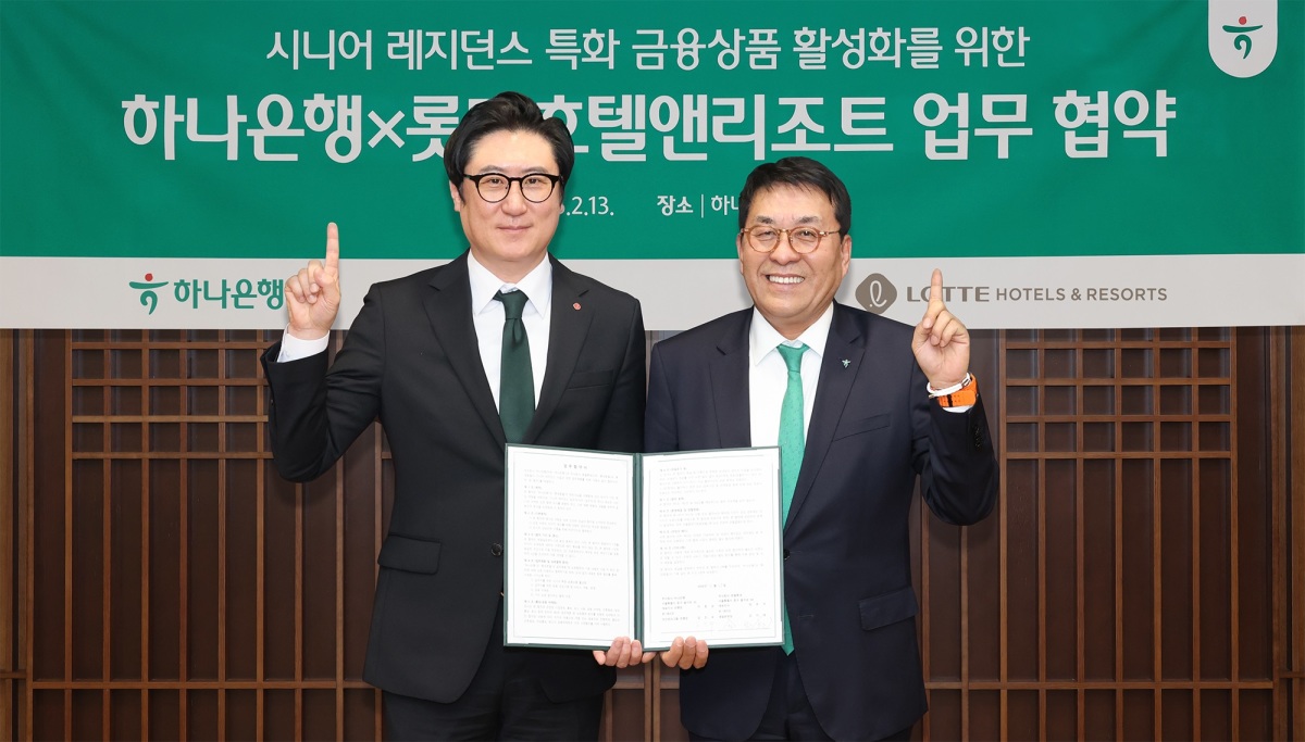 [서울=뉴스핌] 정광연 기자 = 하나은행(은행장 이호성)은 지난 13일 서울시 중구 을지로 본점에서 롯데호텔앤리조트(대표이사 정호석)와 시니어 레지던스 입주민을 위한 특화 금융상품 지원 업무협약을 체결했다고 18일 밝혔다.
