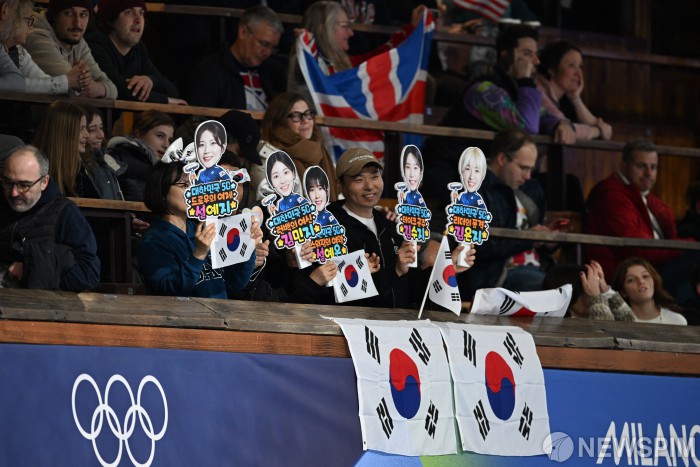[코르티나담페초=로이터뉴스핌] 지난 16일 이탈리아 코르티나담페초 코르티나 컬링 올림픽 스타디움에서 열린 대한민국과 중국 팀의 여자 컬링 경기에서 대한민국 응원단이 응원을 하고 있다. 2026.02.17 photo@newspim.com