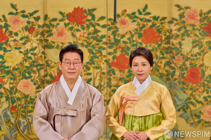 [서울=뉴스핌] 이재명 대통령과 김혜경 여사가 17일 청와대에서 국민들에게 새해 인사를 하고 있다. [사진=청와대] 2026.02.17 photo@newspim.com