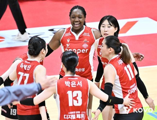 [서울=뉴스핌]이웅희 기자=조이(가운데) 등 페퍼저축은행 선수들이 18일 정관장전 승리 후 기뻐하고 있다. [사진=KOVO] 2026.02.18 iaspire@newspim.com