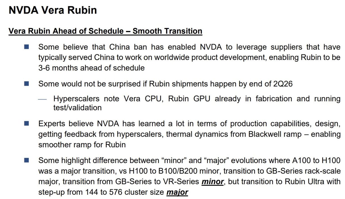 에버코어ISI는 베라·루빈의 조기 출시 동인은 역설적이게도 미국의 대중국 제재라고 했다. 일부 공급망 관계자에 따르면 대중국 수출 금지로 인해 종래 중국 시장을 담당하던 공급업체들이 유휴 상태에 놓이게 됐고 이에 따라 엔비디아는 이 공급망 여력을 글로벌 제품 개발에 재배치함으로써 루빈의 개발 일정을 단축시킬 수 있었다고 한다. 블랙웰 양산 경험 축적도 도움이 된 것으로 전해졌다.