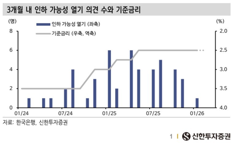 신한투자증권은 이번 금통위에서 남아 있던 '3개월 이내 금리 인하' 포워드 가이던스 1명(신성환 위원 추정)의 의견이 철회돼 금통위 전원이 동결 기조를 지지하는 구도가 완성될 것으로 내다봤다. 지난 1월 금통위에서 이미 대다수 위원이 인하 가이던스를 거둬들인 데 이어 이번에 마지막 한 명까지 전환하면서 당분간 금리 인상도, 인하도 없는 완전한 동결 국면이 공식화된다는 의미다.