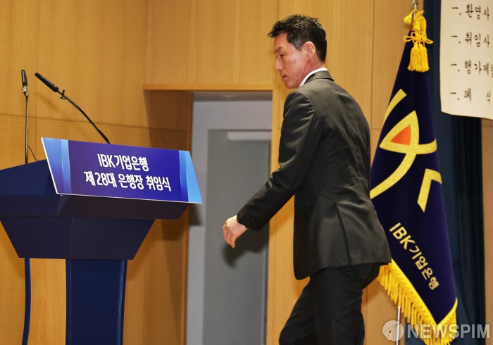 [서울=뉴스핌] 양윤모 기자= 장민영 제28대 IBK기업은행장이 20일 오전 서울 중구 을지로 본점 15층 대강당에서 개최된 취임식에 참석해 취임사를 위해 이동하고 있다. 장 은행장과 노조는 시간외수당 미지급 문제를 13일 ‘미지급 수당 문제 정상화’에 대한 선언적 합의를 담은 교섭안에 서명했으며 한달만에 취임식을 개최했다. 2026.02.20 yym58@newspim.com