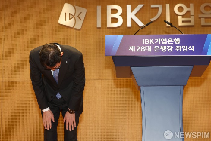 [서울=뉴스핌] 양윤모 기자= 장민영 제28대 IBK기업은행장이 20일 오전 서울 중구 을지로 본점 15층 대강당에서 개최된 취임식에 참석해 취임사를 마치고 직원들에게 고개숙여 인사하고 있다. 장 은행장과 노조는 시간외수당 미지급 문제를 13일 ‘미지급 수당 문제 정상화’에 대한 선언적 합의를 담은 교섭안에 서명했으며 한달만에 취임식을 개최했다. 2026.02.20 yym58@newspim.com