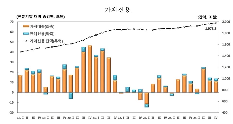 20일 한국은행이 발표한 '2025년 4/4분기 가계신용(잠정)'에 따르면 지난해 4분기말 가계신용 잔액은 1978조8000억원으로 전분기말 대비 14조원 증가했다. 증가율은 전기 대비 0.7% 수준이다.