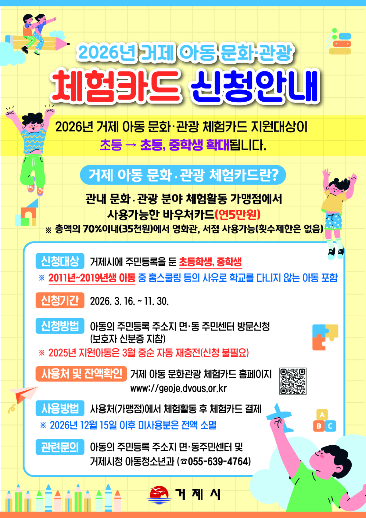 [거제=뉴스핌] 남경문 기자 = 경남 거제시는 아동 문화·관광 체험카드 지원 대상을 초등학생에서 초·중학생으로 확대한다고 20일 밝혔다.