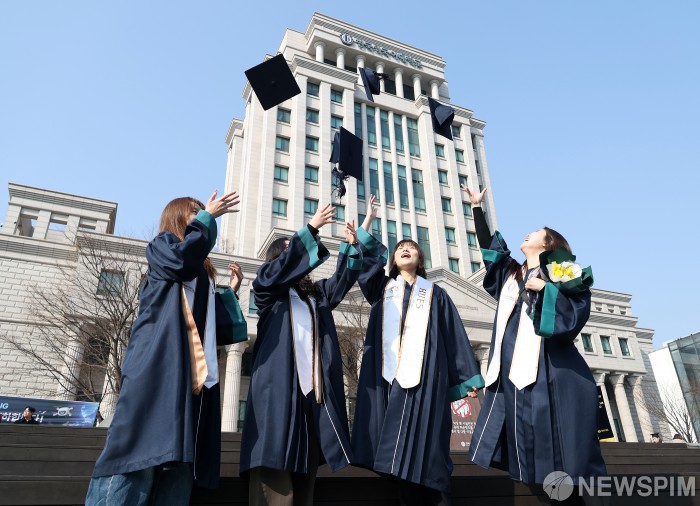 [서울=뉴스핌] 정일구 기자 = 20일 서울 동대문구 한국외국어대학교에서 열린 2026년 전기 학위수여식에서 졸업생들이 학사모를 던지고 있다. 2026.02.20 mironj19@newspim.com