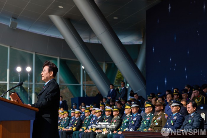 [서울=뉴스핌] 이재명 대통령이 지난 20일 충남 계룡대 대연병장에서 열린 2026년 3군 사관학교 통합임관식에서 축사를 하고 있다. [사진=청와대] 2026.02.21 photo@newspim.com