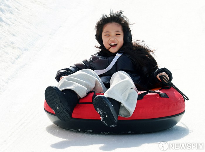 [서울=뉴스핌] 22일 주말을 맞아 평창군 대관령면 횡계리 송천 일대 축제장에서 열린 '제34회 평창 대관령눈꽃축제'를 찾은 방문객들이 눈썰매를 타며 마지막 겨울 축제를 즐기고 있다. 올해 축제는 온화한 날씨에도 불구하고 설연휴 기간 많은 방문객이 몰려 전년도에 비해 방문객 수가 10퍼센트 증가한 12만 3천 여명을 기록, 성황리에 마쳤다.[사진=평창관광문화재단] 2026.02.22 photo@newspim.com